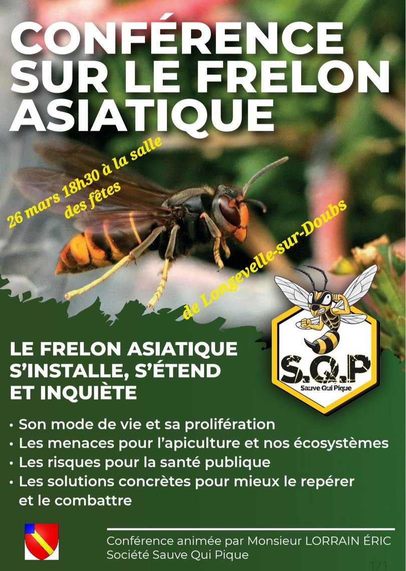 Éric LORRAIN animera une conférence sur le frelon asiatique jeudi 26 mars 2026 à la salle des fêtes de Longevelle sur Doubs.