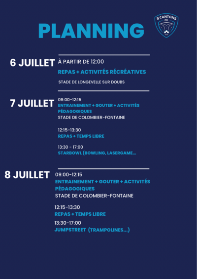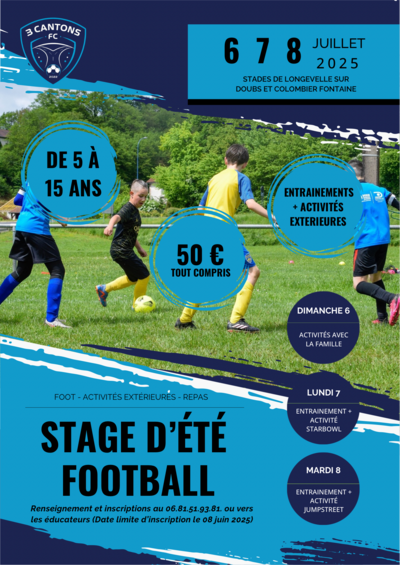 Le FC Trois-Cantons organise un stage pour les enfants de 5 à 15 ans du 6 au 8 juillet 2025 aux stades de Longevelle sur Doubs et de Colombier-Fontaine.