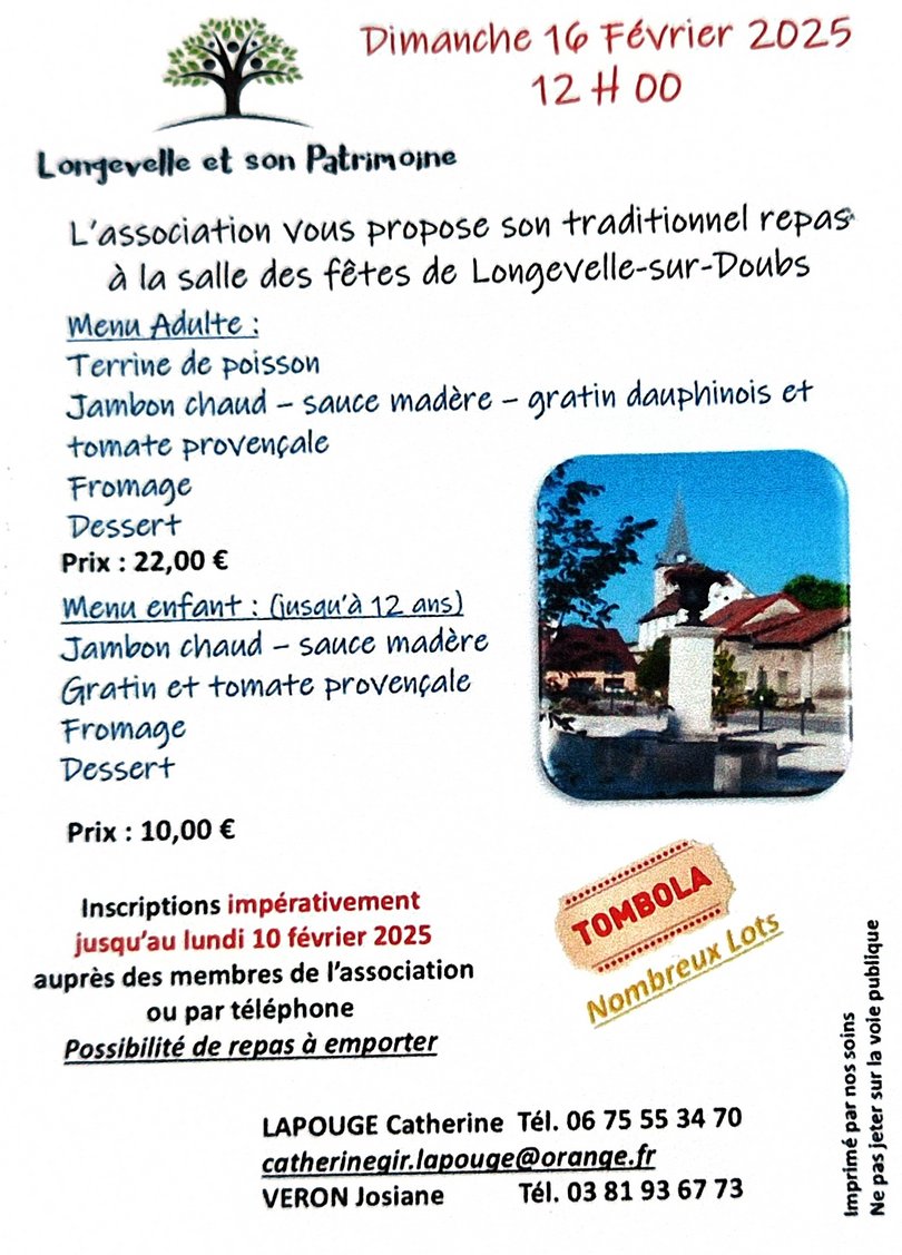 L'association Longevelle et son Patrimoine vous propose son traditionnel repas à la salle des fêtes du village dimanche 16 février 2025 à 12h.