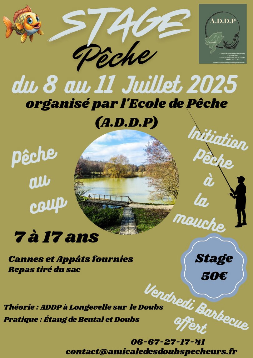 L'école de Pêche de l'Amicale Des Doubs Pêcheurs organise un stage Pêche du mardi 8 au vendredi 11 juillet 2025 pour les jeunes de 7 à 17 ans.