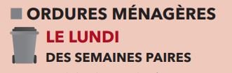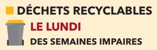 - Les bacs à ordures ménagères et les bacs jaunes sont collectés toutes les deux semaines en alternance (voir le calendrier de notre commune),