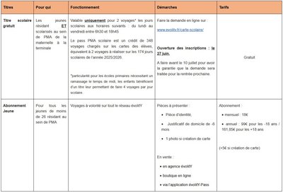 Pour les élèves souhaitant bénéficier du titre de transport scolaire gratuit 2025/2026, la demande doit être faite sur le site internet https://www.evolity.fr/carte-scolaire/ avant le 20 juillet pour être assuré d’avoir leur titre à la rentrée.