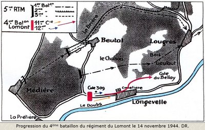 À Longevelle, l'attaque est lancée depuis le coteau de Vaux aux Beussières, les FFI du Lomont épaulent le 5ème Régiment de Tirailleurs Marocains qui appartient à la première Armée Française. Les combats sont violents et intenses dans les bois du Chanois qui dominent Longevelle mais aussi en bordure du Doubs à proximité de la route qui traverse notre village. Malheureusement c’est ici que les premiers hommes tombent sous le feu ennemi, au total 14 périront en ce sinistre jour de novembre.